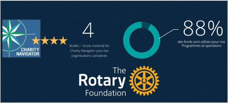 La Fondation Rotary obtient depuis 17 ans la note maximale de 4 étoiles de Charity Navigator, un organisme indépendant de cotation qui distingue la qualité de gestion de la Fondation. 88% des fonds sont utilisés pour les programmes et les actons.